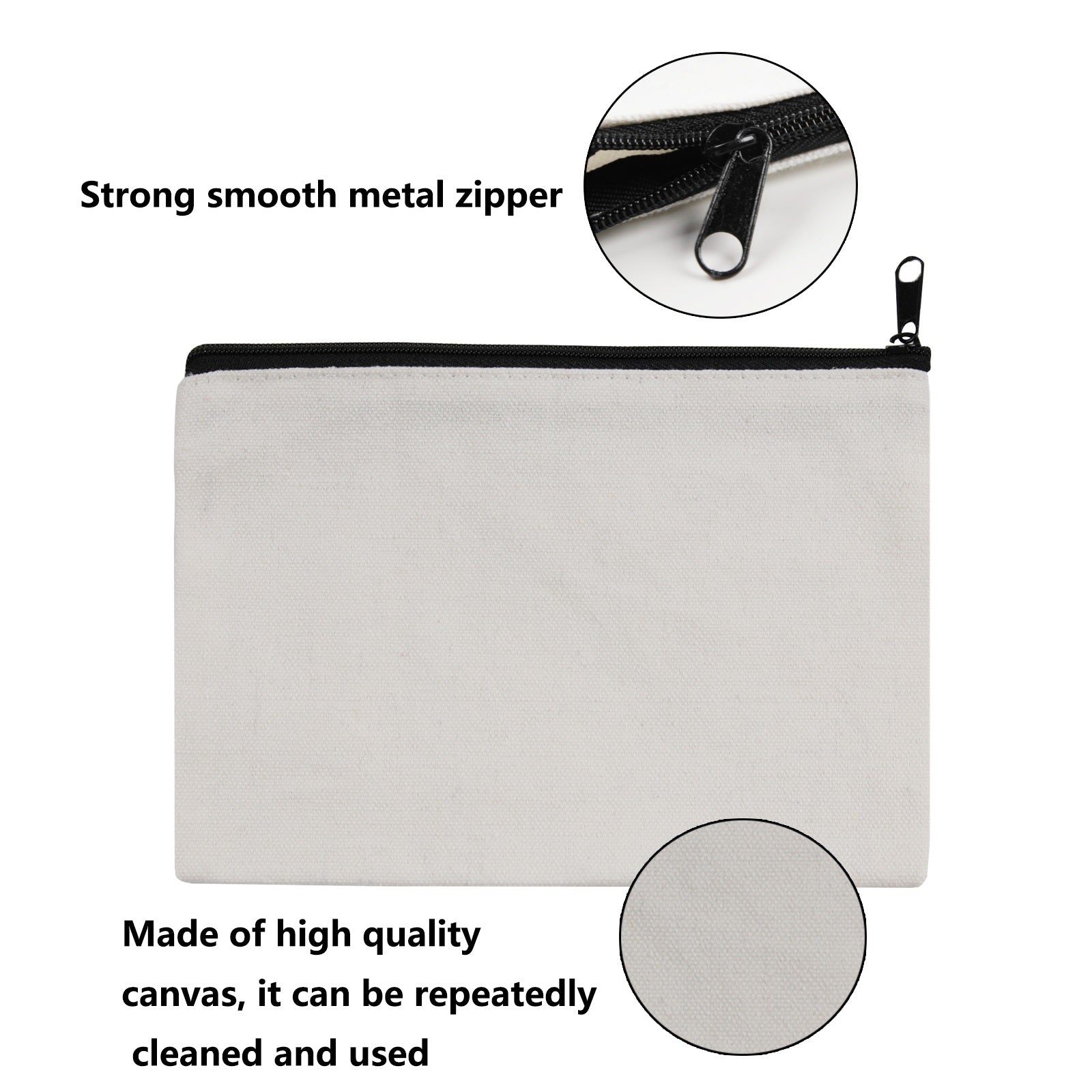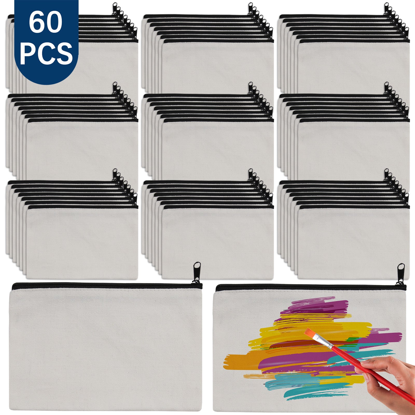 Upgrade your DIY projects with this bulk pack of 60 pcs sublimation cosmetic bags. Each bag comes in white polyester canvas with a durable black zipper, perfectly sized at 7.08 × 4.72 inches (18 × 12cm)—ideal for makeup storage, pencil cases, or personalized gifts.
